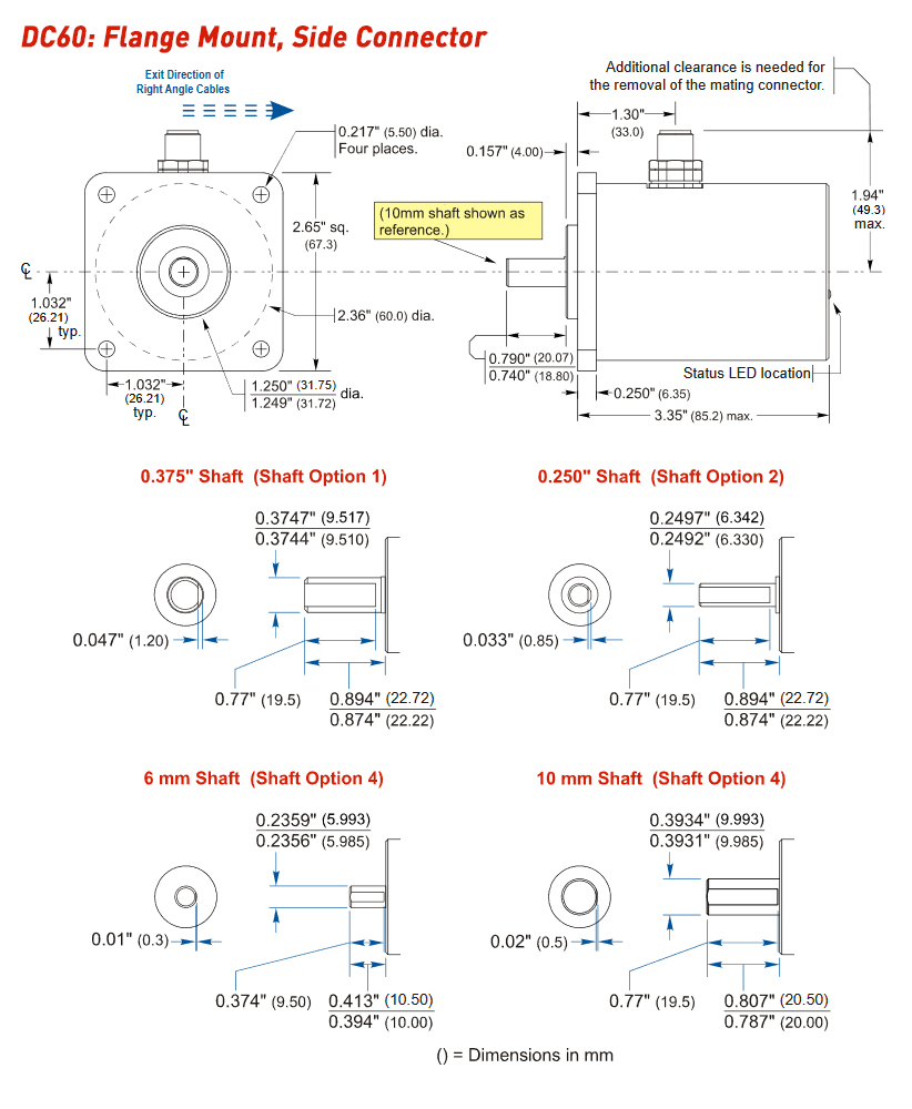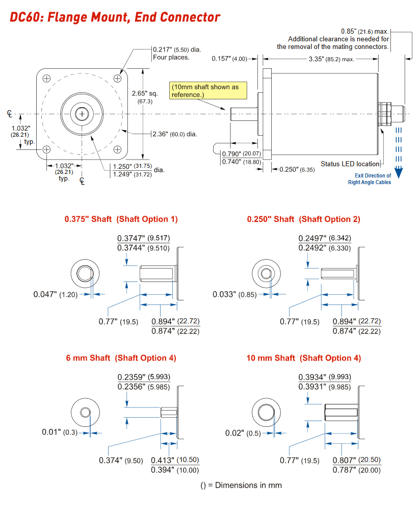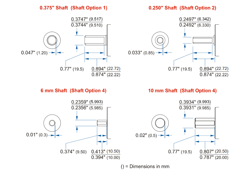 | Shaft: | - 0.375" dia x 0.884" long, w/ 0.047" x 0.77" flat - 0.250" dia x 0.884" long, w/ 0.033" x 0.77" flat - 6 mm dia x 10.25 mm long, w/ 0.3 mm x 9.5 mm flat - 10 mm dia x 20.25 mm long, w/ 0.5 mm x 19.5 mm flat |
