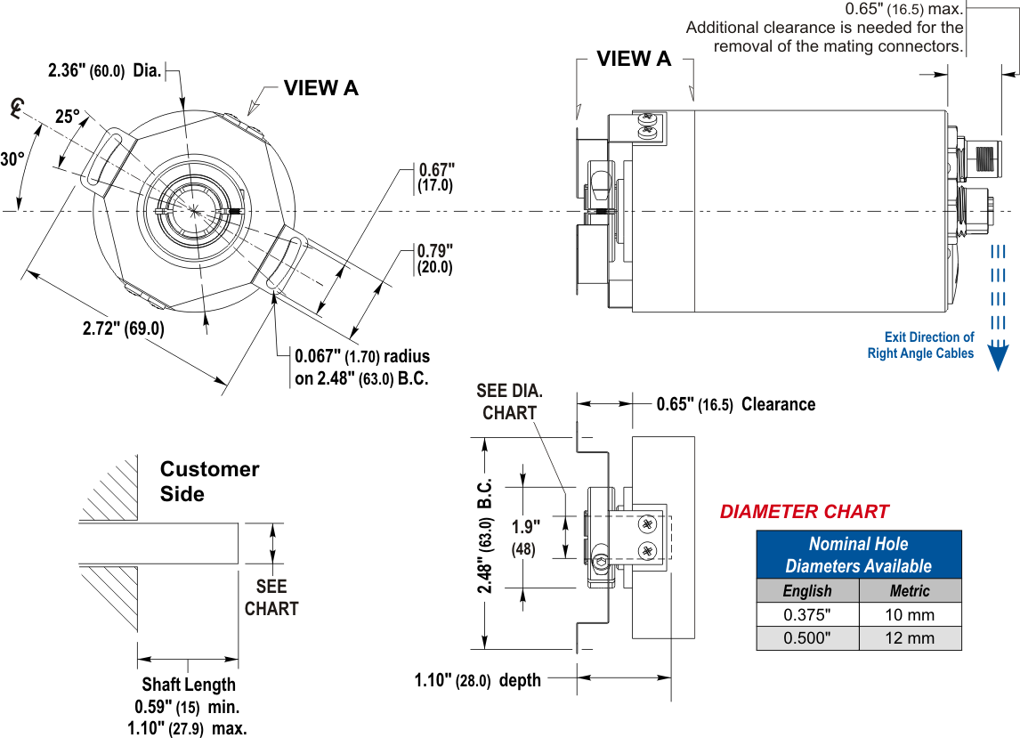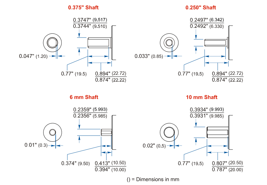 | Shaft sizes: | Standard shaft 1/4" , 3/8", 6 mm, or 10 mm diameter stainless steel Blind shaft hole 0.375", 0.5", 10mm, 12mm diameter |